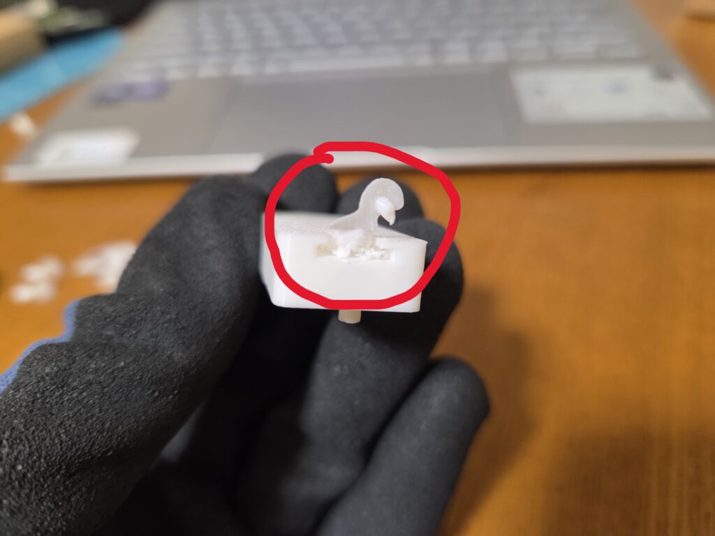 3つの部品のうちレールがある部品は、レール全体にサポートが付着する感じになり、サポートがかなり取りづらくなってしまいました(下の画像2枚)。なので、ここはサポートをつけない or サポートの量を減らす の調整をした方が良いと思います。